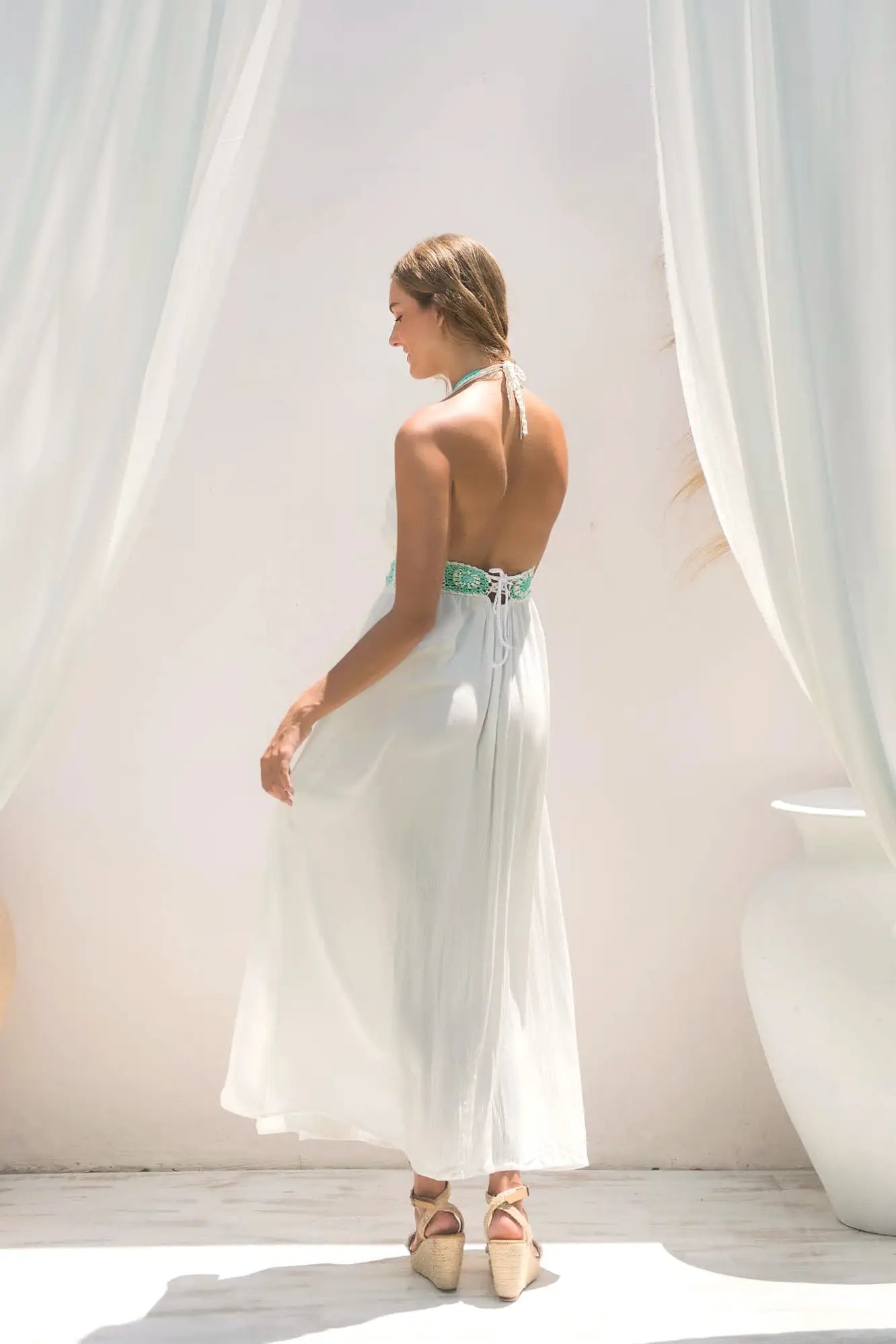Das Kleid Fiji ist ein atemberaubendes Maxikleid, wie gemacht für Sommertage, die du nie vergessen wirst. Es besticht durch einen tiefen V-Ausschnitt und ein elegantes Halter-Design (Neckholder), das deine Schultern wunderschön in Szene setzt. Ein besonderes Highlight sind die kunstvollen Häkel-Details (Crochet Patches), die jedes Stück zu etwas Besonderem machen.