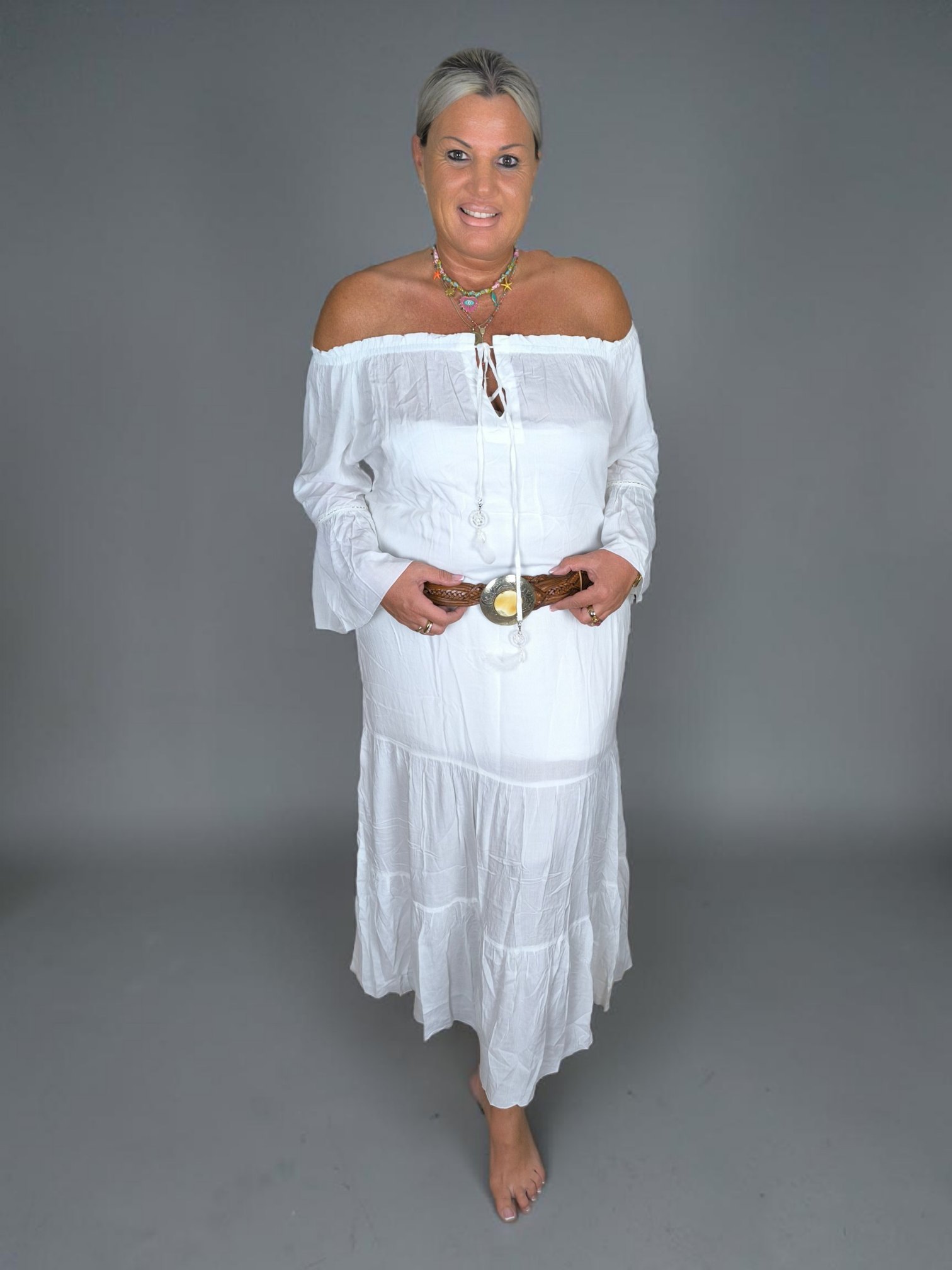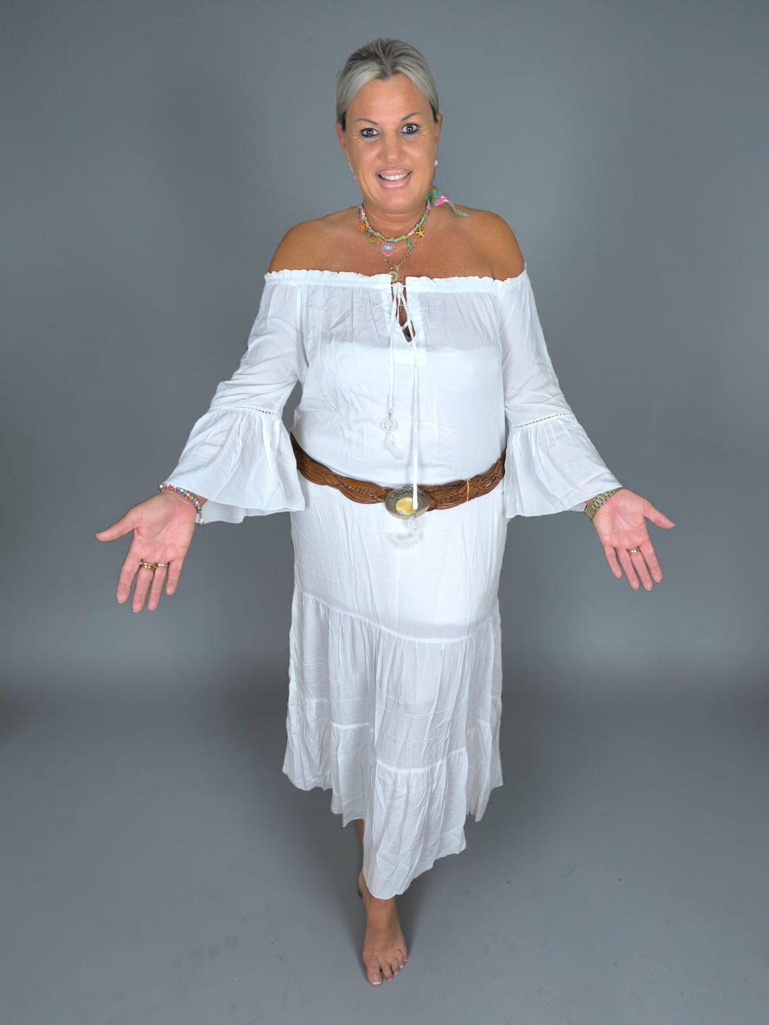 Das Kleid überzeugt mit dem gewohnt ikonischen Off-the-Shoulder-Schnitt, einem romantisch gerafften Ausschnitt und zarten Bändern, die mit kleinen Traumfängern verziert sind. Die ausgestellten Ärmel mit handgefertigten Spitzenbesätzen und der gestufte Rock verleihen dir einen Hauch magischer Weiblichkeit. In diesem Kleid wirst du Erinnerungen schaffen, die ein Leben lang bleiben.